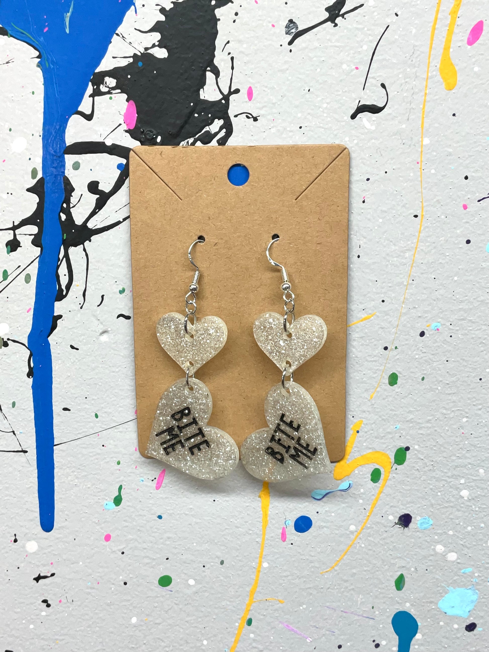 These glittery white heart earrings scream "BITE ME" with unapologetic sass and sparkle. Perfect for anyone who wants to inject a bit of attitude into their look. With their hypoallergenic hooks, even sensitive ears can join in on the fun. Ready to let your ears do the talking?