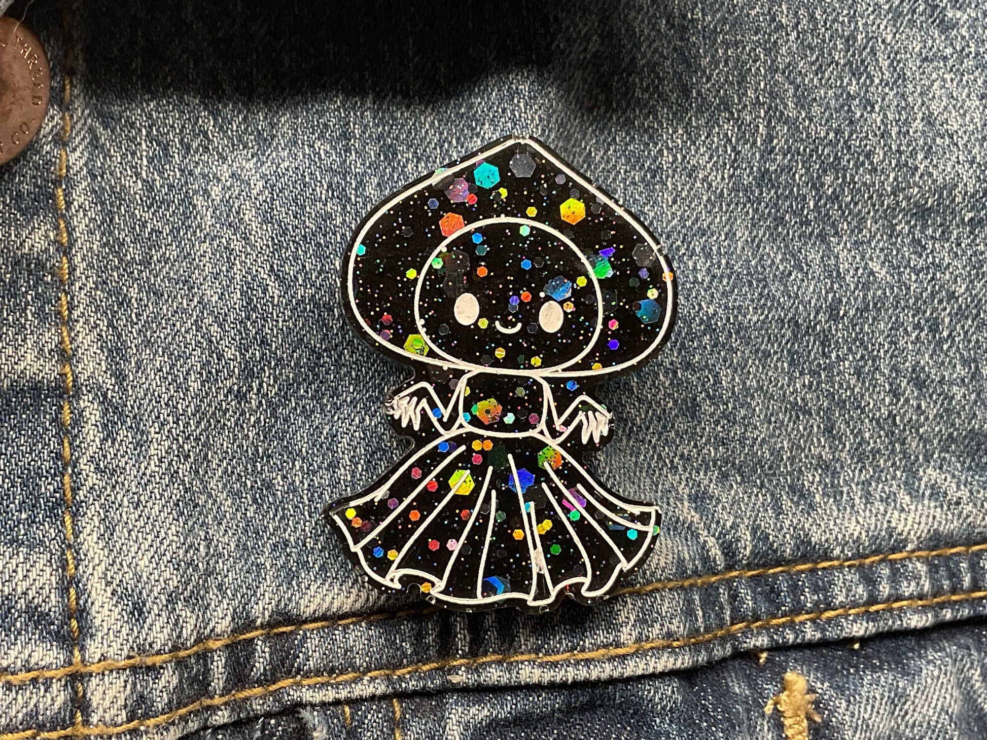 Slap on some spooky sparkle with this Flatwoods Monster pin. It is your new go to for slapping supernatural charm on anything from jackets to backpacks. Its black base is bursting with colorful holographic flecks that catch the light and demand attention wherever you go.