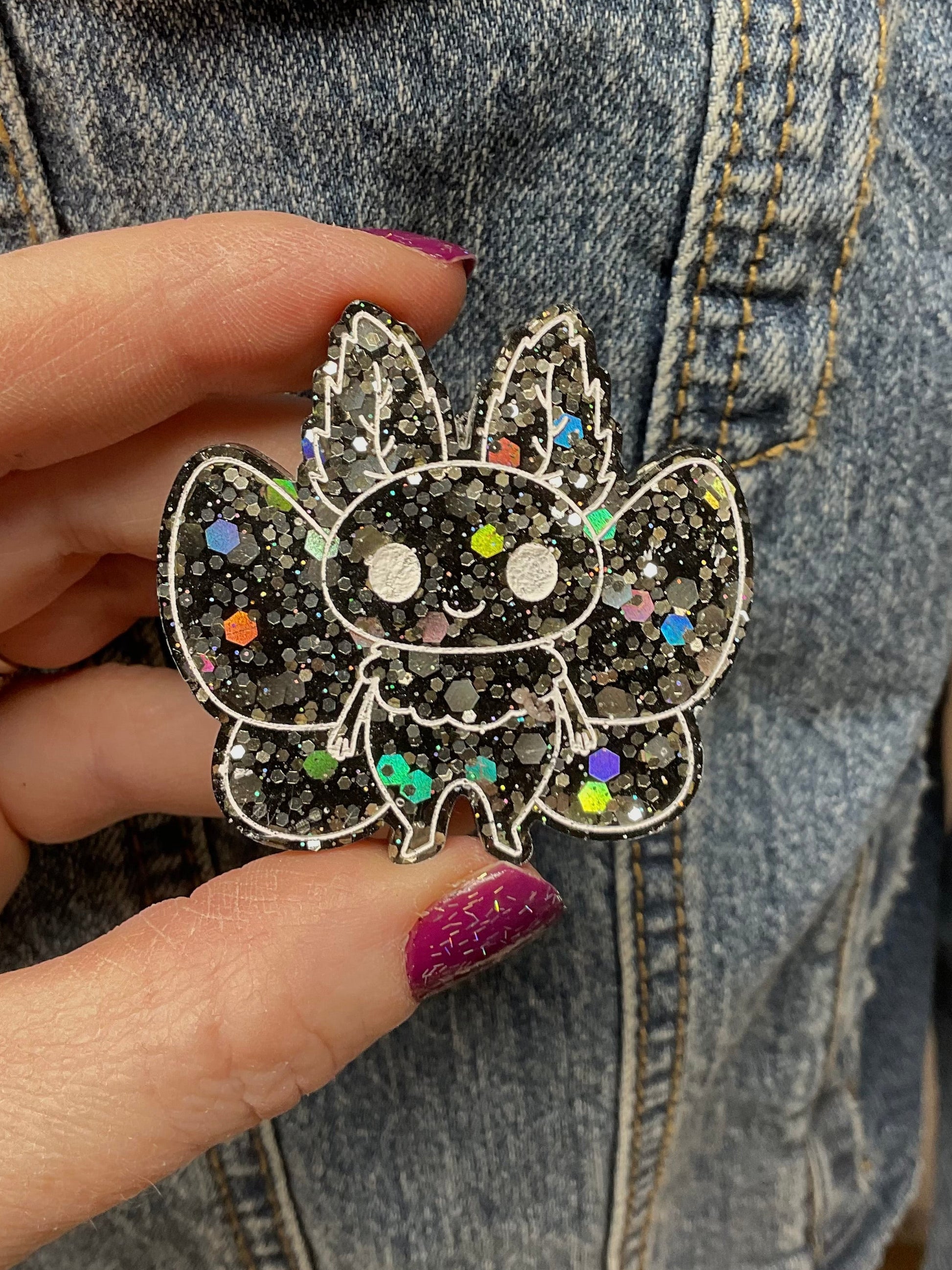 Get ready to dazzle with this Black Glitter Bomb Mothman Pin, a powerhouse of sparkle and charm. Its cute, wide winged and large eyed design is packed with multi-colored glitter that refuses to go unnoticed. Perfect for jazzing up your jacket, backpack, or any spot that needs a bold splash of nocturnal magic.