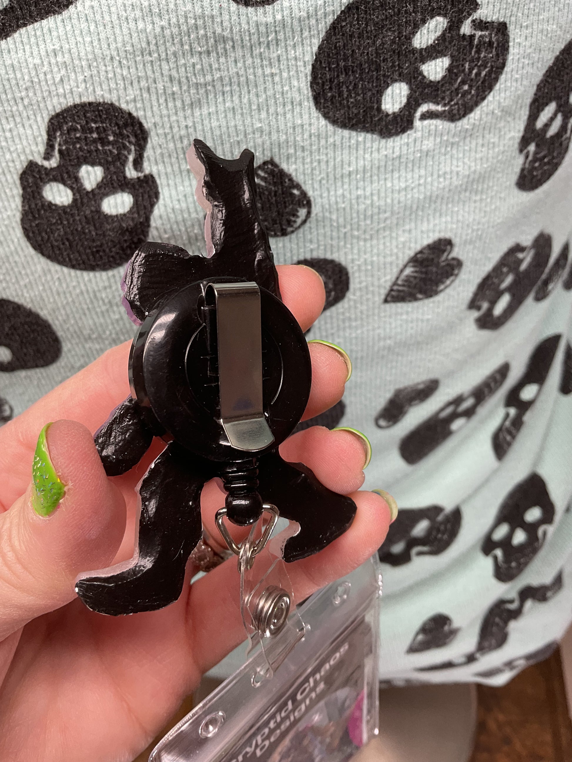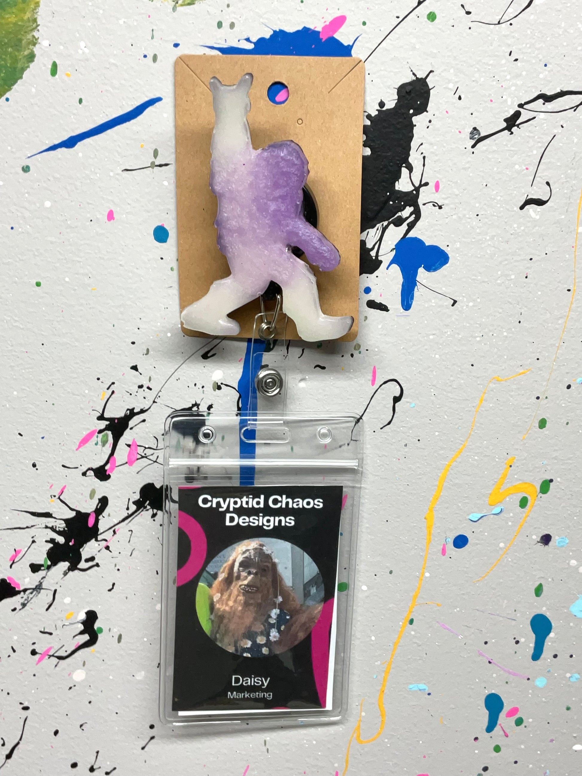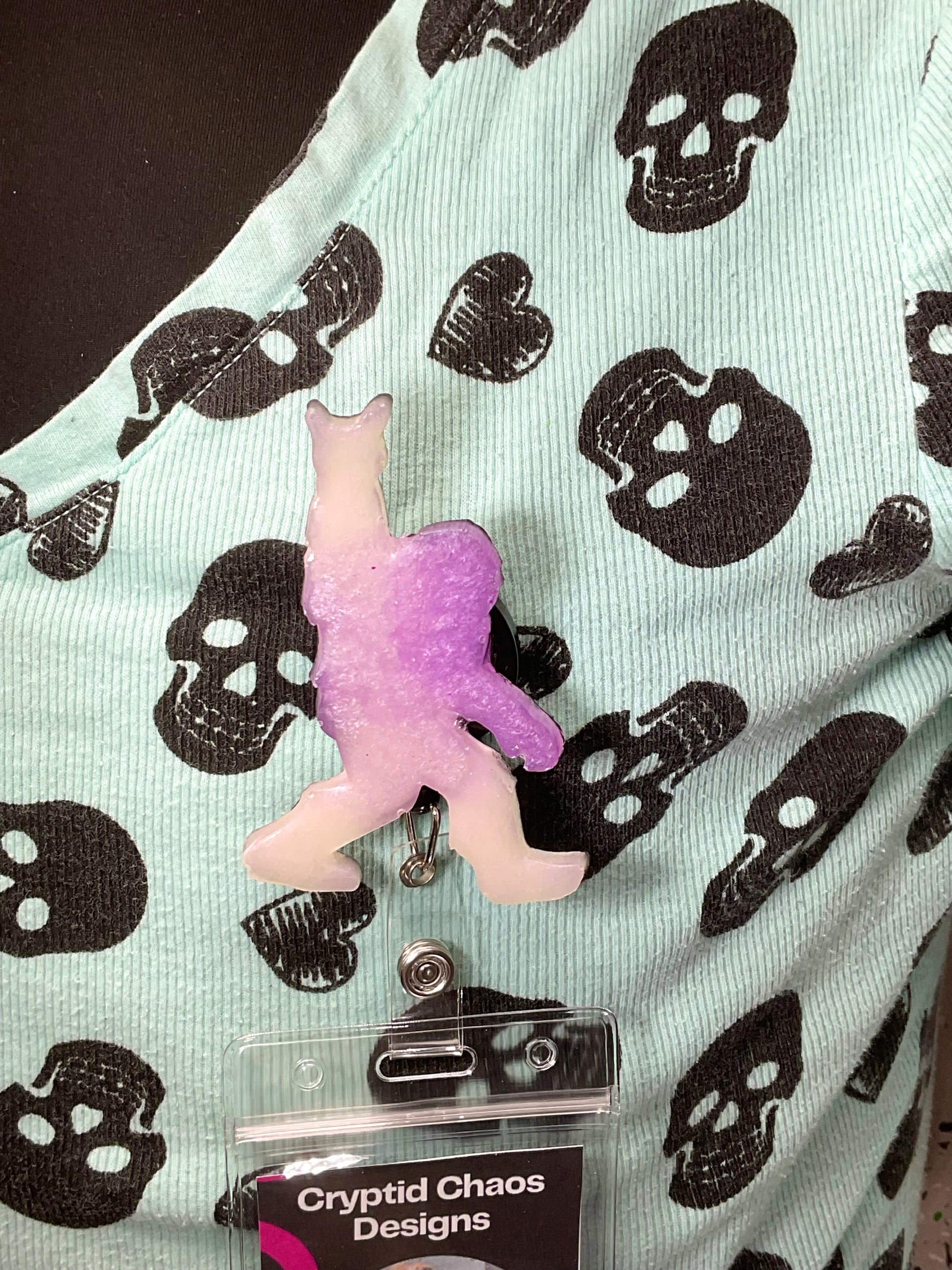 Here it is: the Purple & White Bigfoot Resin Badge Reel that glows in the dark! This cryptid chaos champion is ready to slap boring badges into the shadows while you shine bright like a mythical monster. With its glow-in-the-dark resin and Bigfoot giving a rock and roll hand, it’s the badge reel that screams "I'm here and I'm legendary!"
