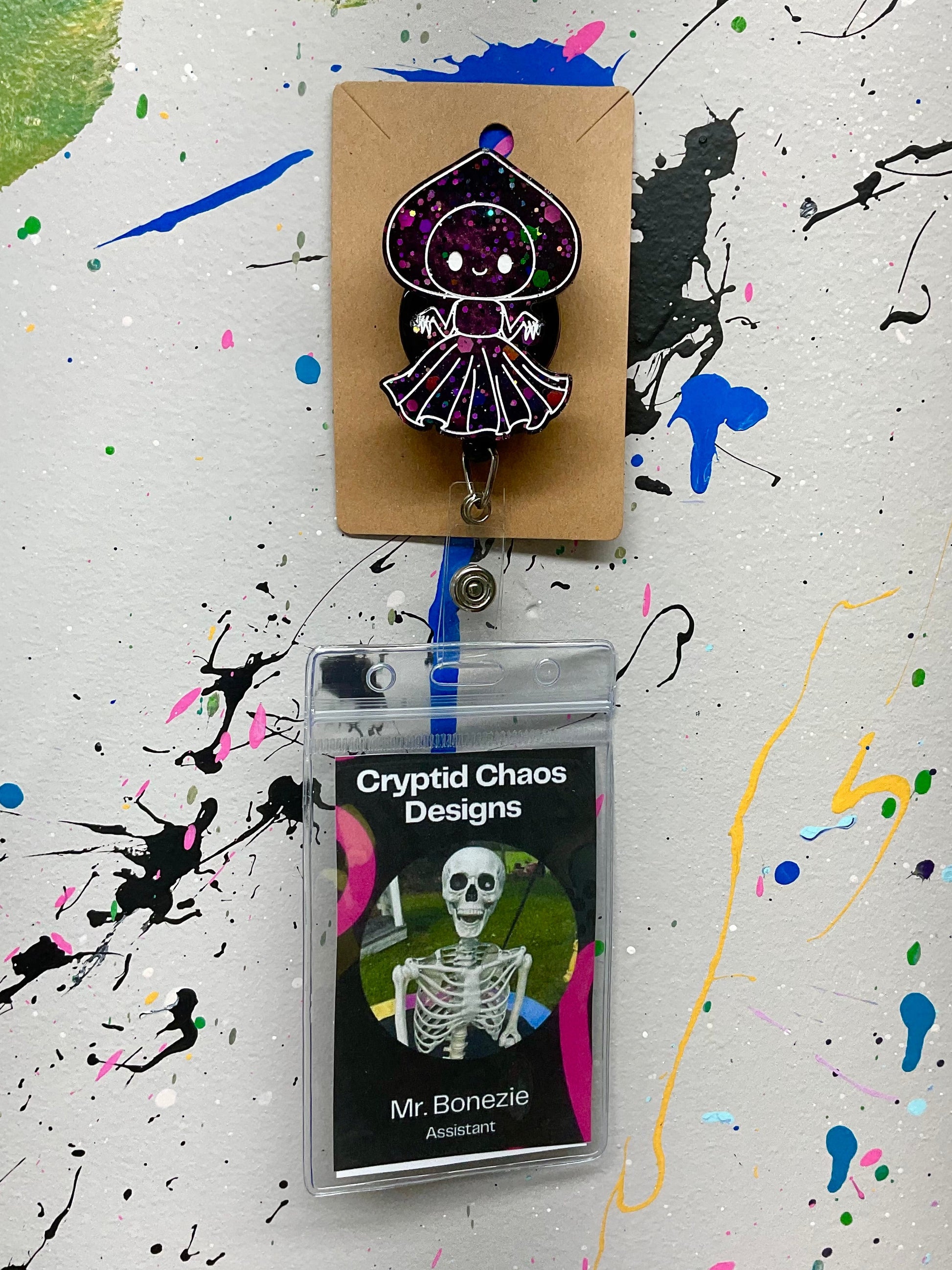This glitter drenched Flatwoods Monster badge reel is ready to slap some cosmic chaos right onto your work ID! Who knew adorable alien nightmares could be this sparkly? This little gal has got a retractable cord, so your ID can live its best life without getting stuck in the void.
