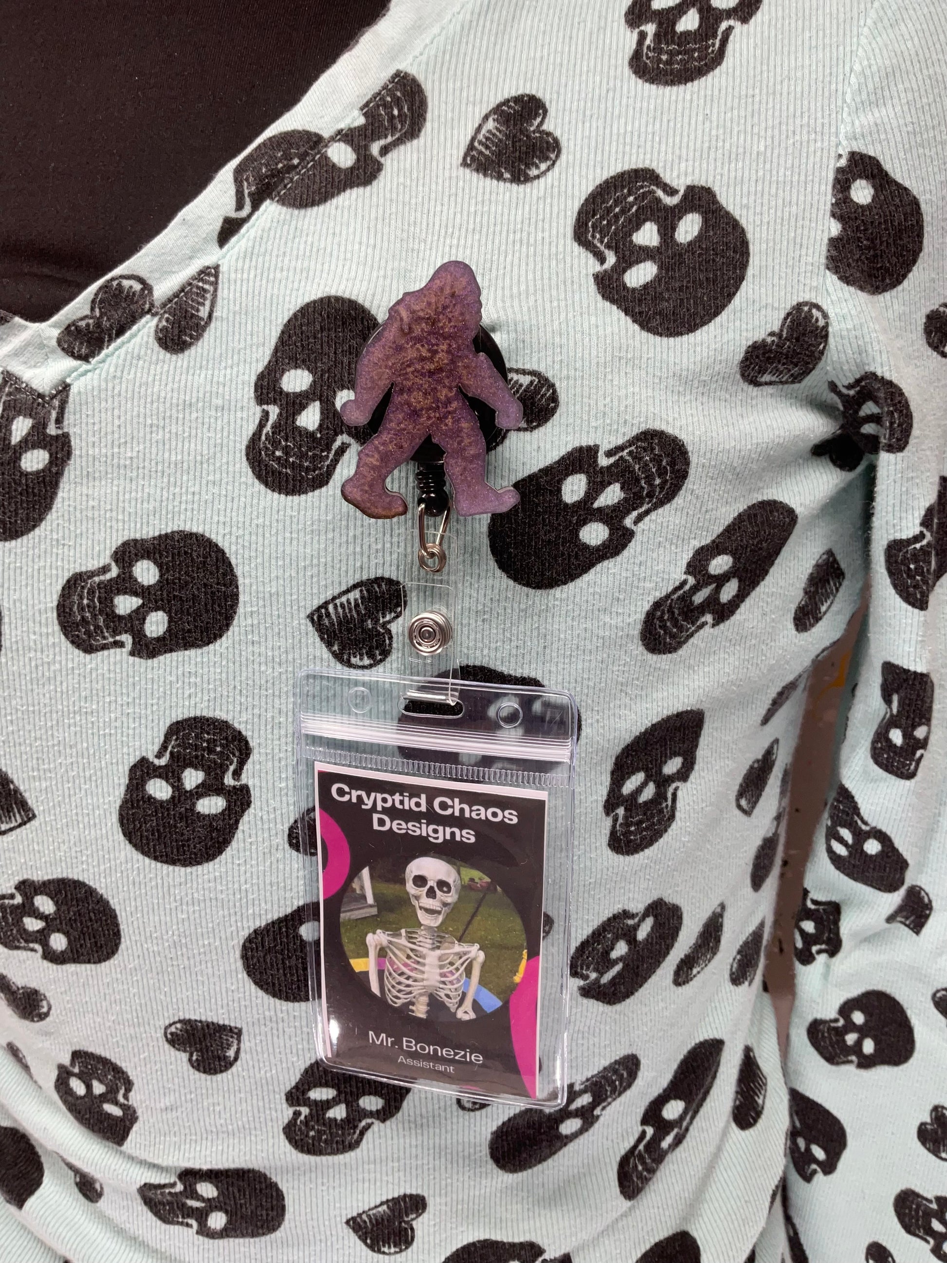 Unleash your inner cryptid with this bold purple Bigfoot resin badge reel. Crafted with a textured finish, this mythical creature silhouette demands attention and adds a daring edge to your everyday badge. Ready to clip on and pull out, it’s a must have for those who like their accessories to roar with personality.