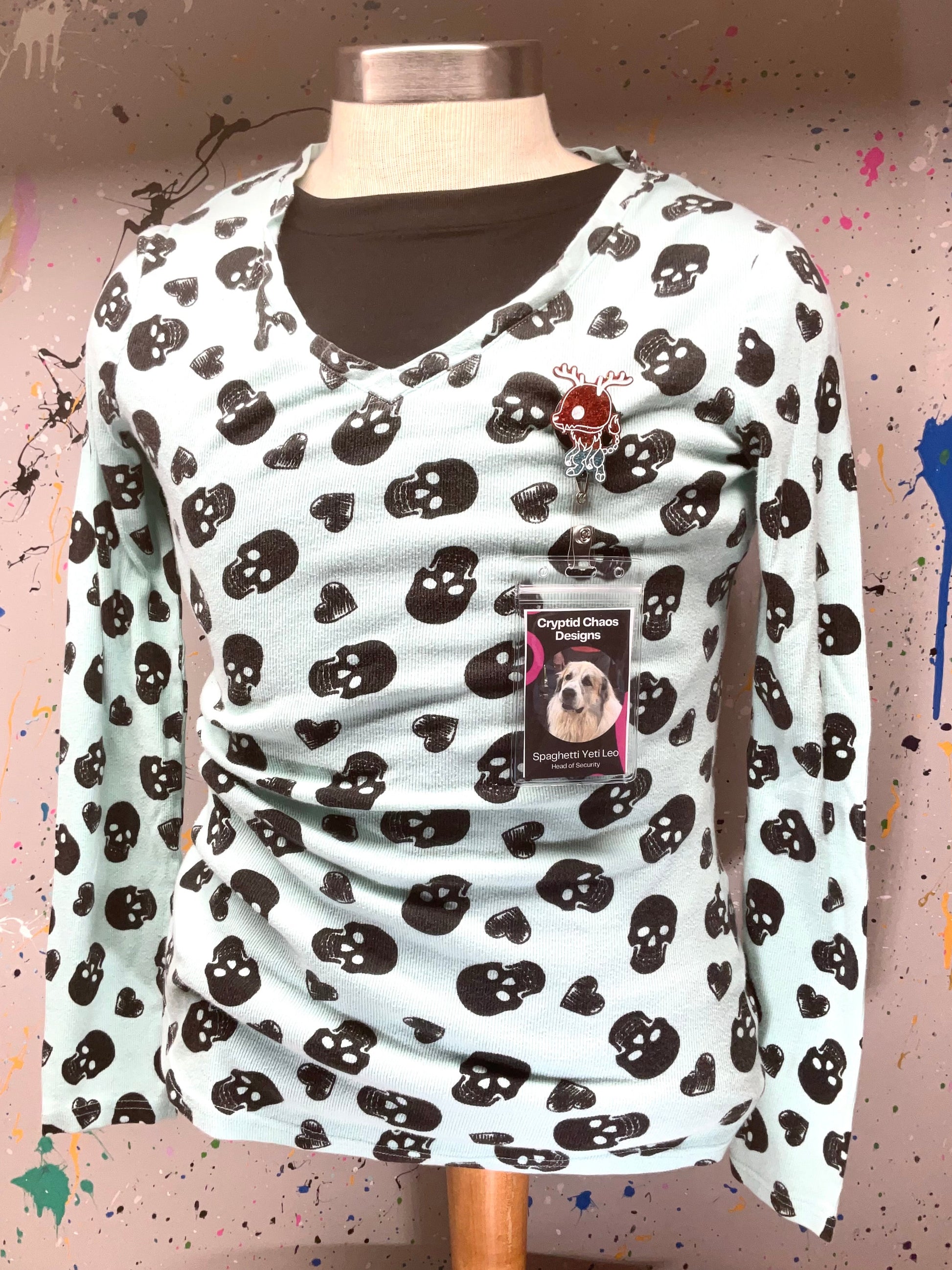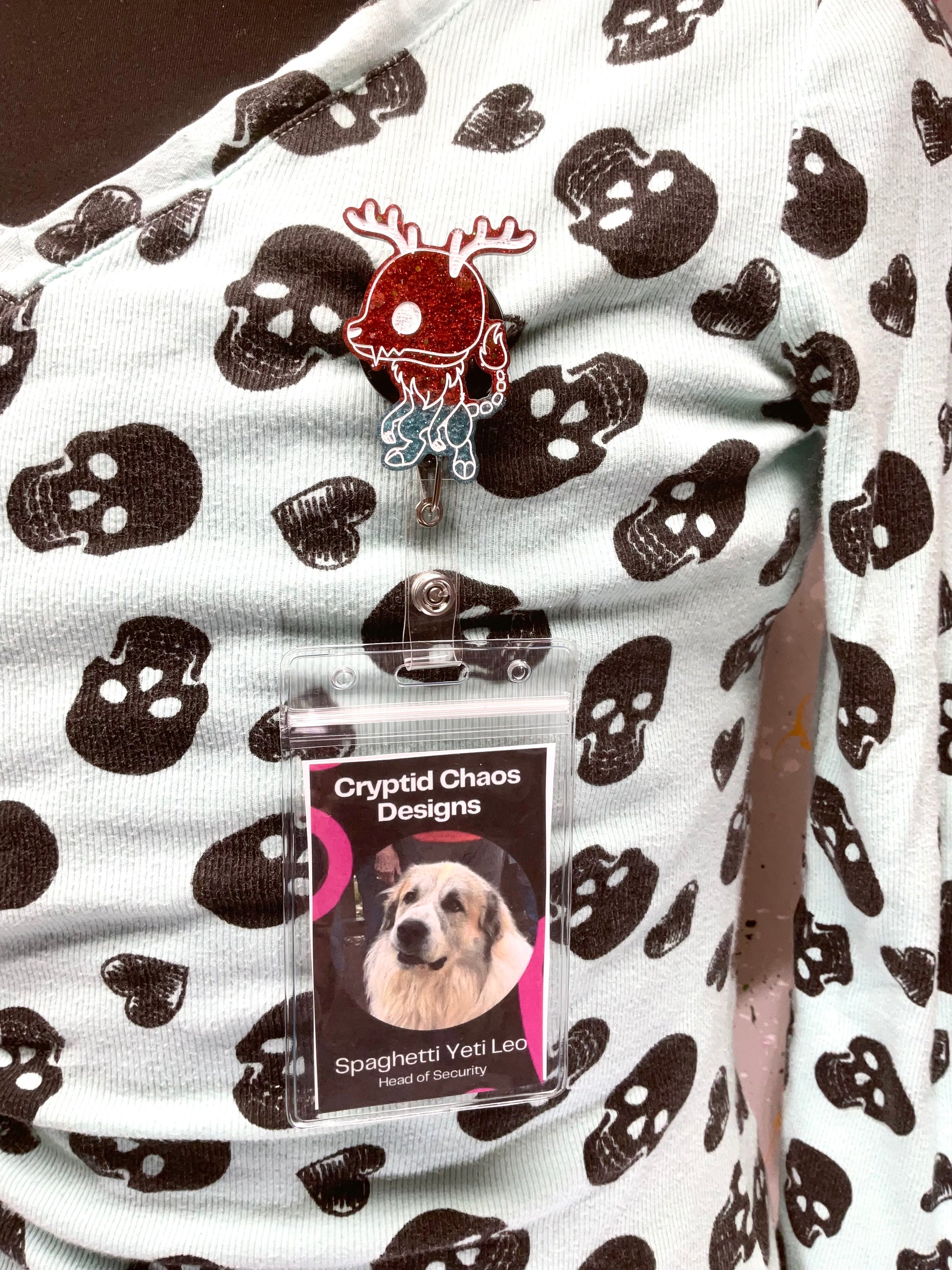 Grab the Red & Blue Glitter Wendigo Badge Reel and blast your work ID into a realm of sparkly nightmare fuel. This fierce little cryptid flaunts a glitter-infused red head and a contrasting blue body, outlined sharply in white, ready to make your badge the star of any dull workplace. Who said your workday couldn’t have a little supernatural sass?