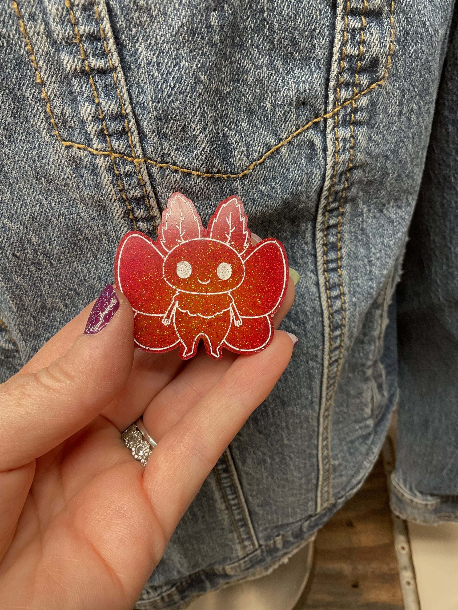 Ignite your style with the Fiery Red Mothman Pin, a blazing burst of glitter and charm. This bold, eye catching pin features a Mothman in vibrant red glitter that refuses to blend into the background. Perfect for your denim jacket, backpack, or any gear craving an explosive pop of personality.