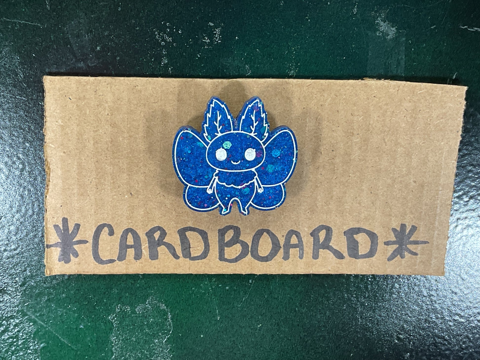 Meet your new fridge MVP. This little cutie dazzles with a deep blue, fierce multicolored glitter and is outlined in hand painted white. It’s not just a magnet, it’s an attitude, ready to hold your notes, photos, or secret messages with an unbreakable grip and cosmic flair.