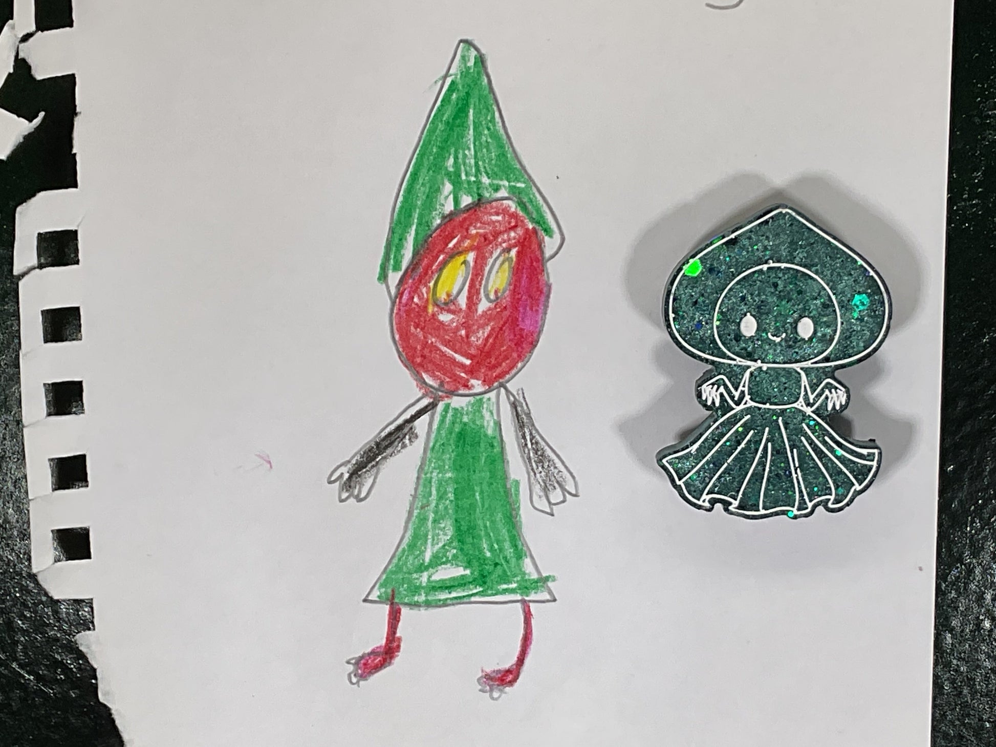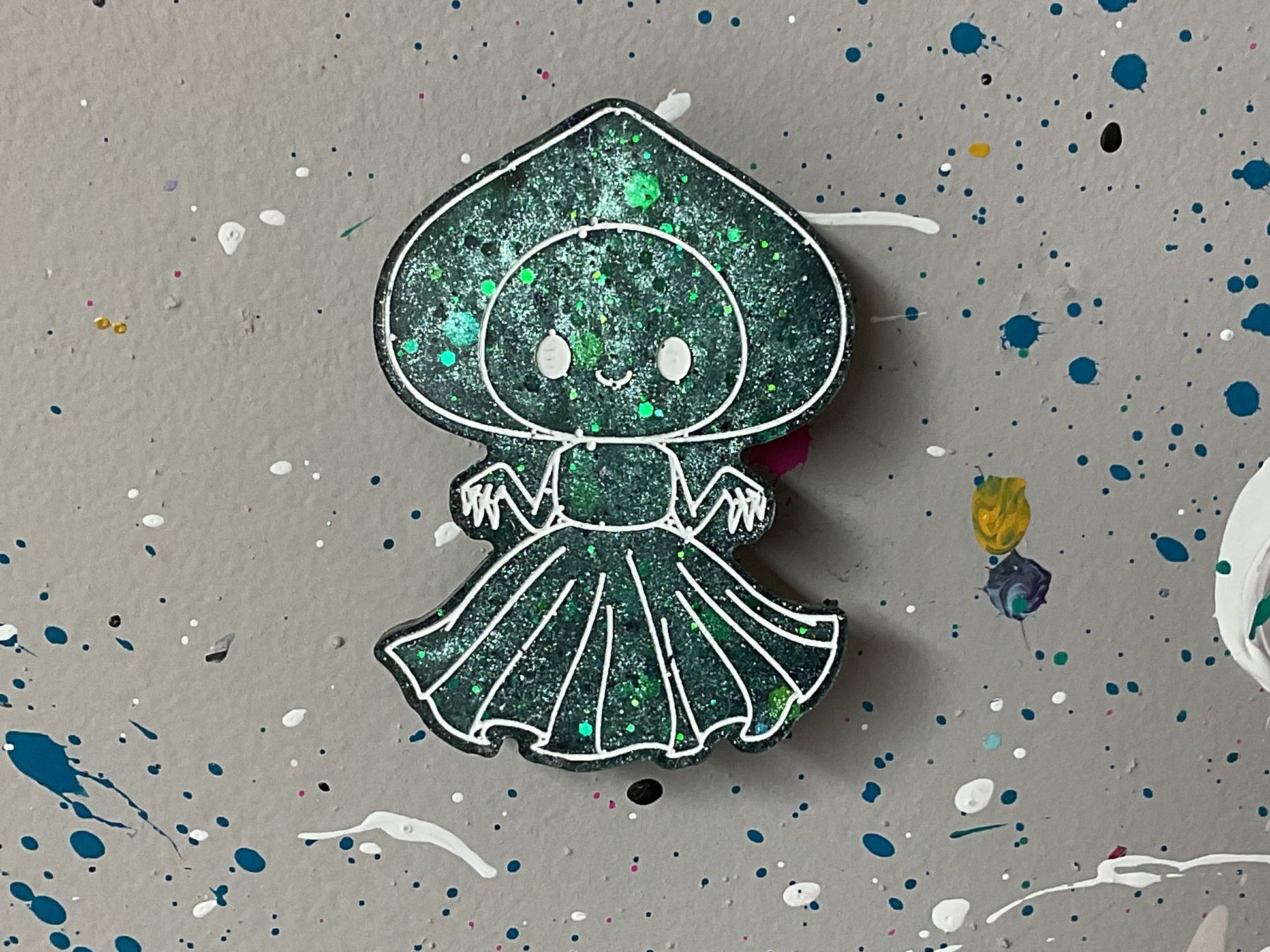 Get ready to own the ultimate green glitter Flatwoods Monster magnet, a cryptid rebel bursting with emerald sparkle and cheeky charm. This little lady has a wide, spade shaped head with large eyes and a flowing skirt, all outlined in hand painted white lines to make every glittery detail scream boldness. It clings ferociously to any magnetic surface due to its powerful ceramic magnet backing, ready to dominate your fridge or workspace with attitude.