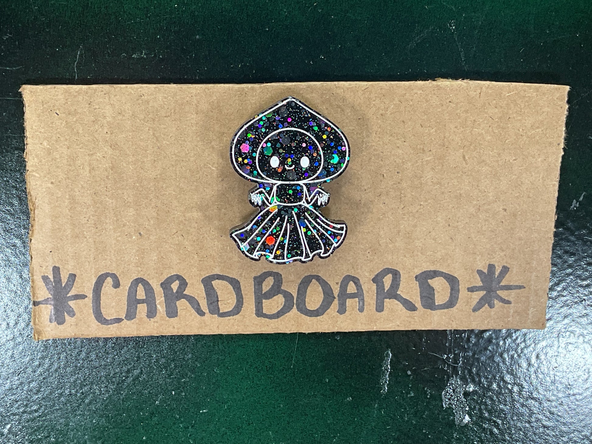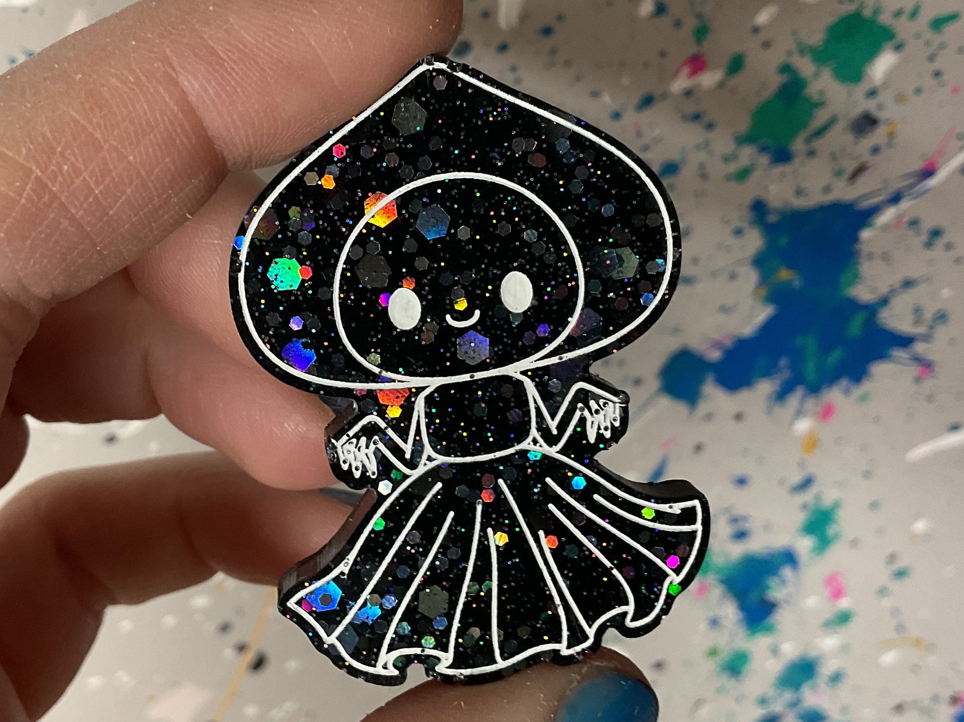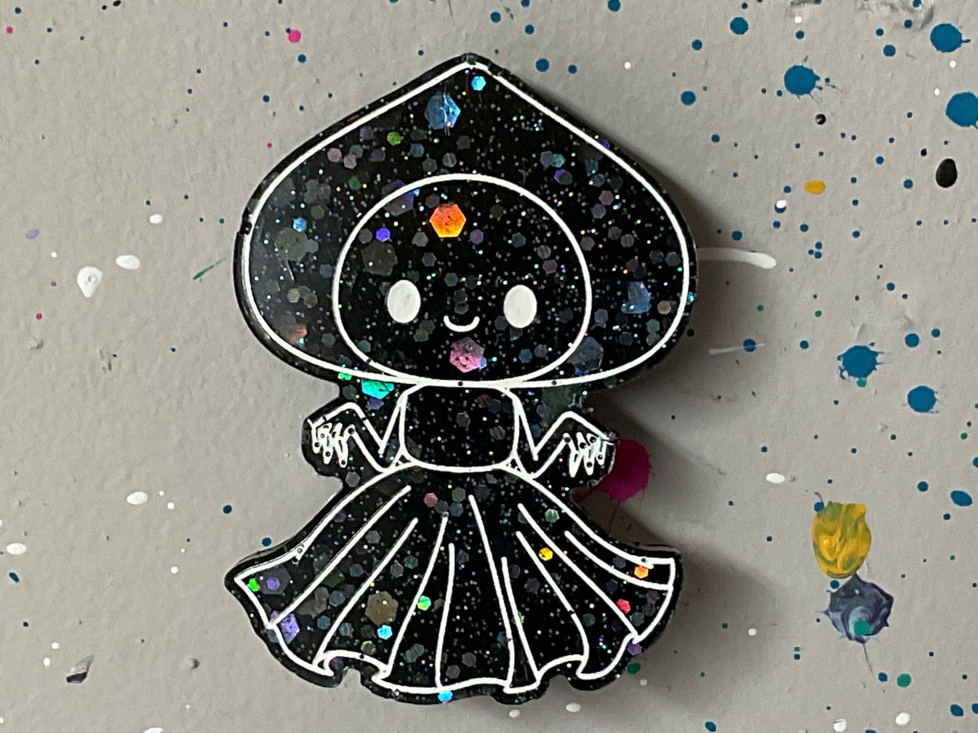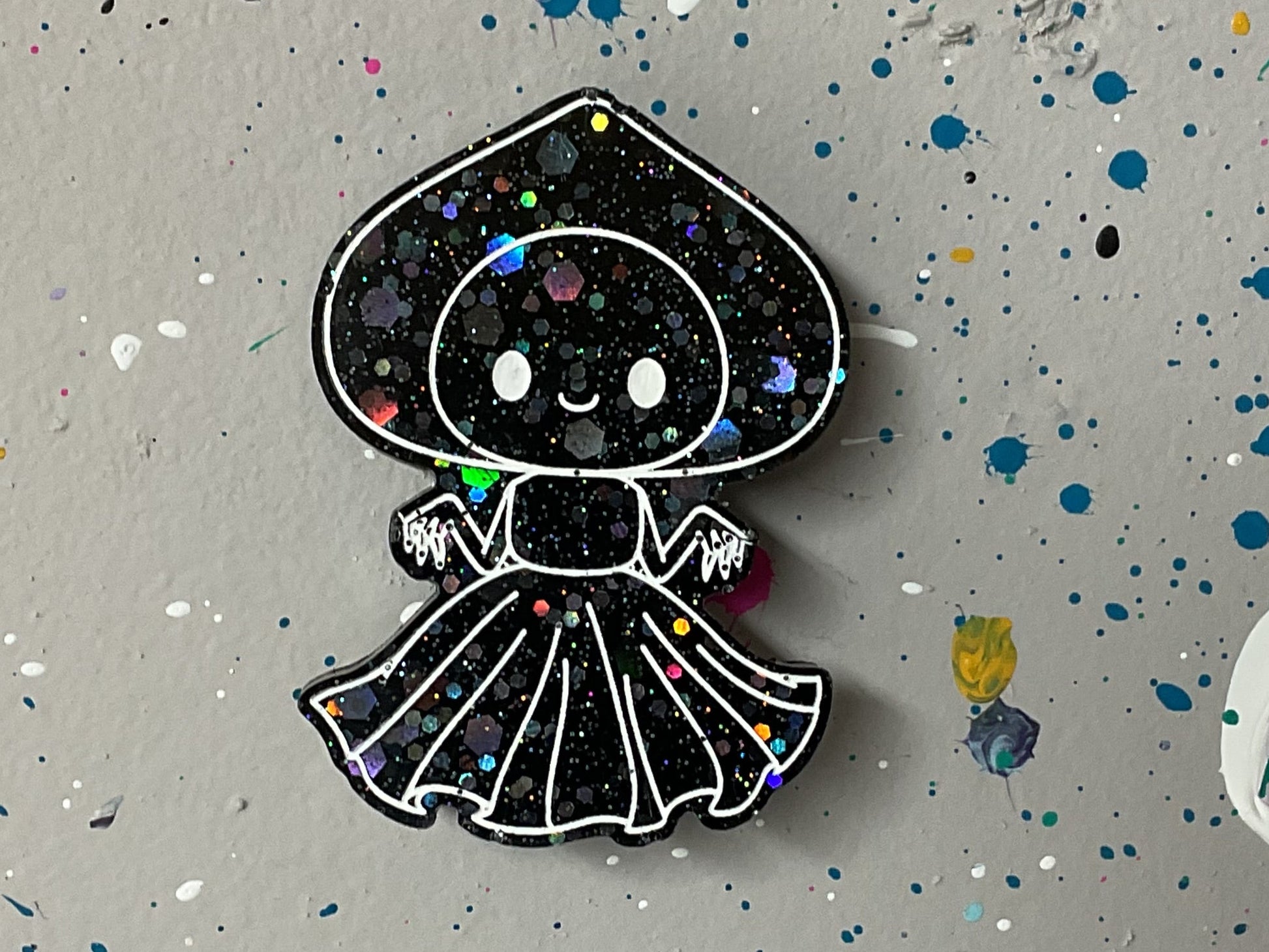 Prepare yourself for the Flatwoods Monster magnet, an adorable little lady cloaked in a black and blasted with chaotic holographic glitter that screams ‘I’m here for the party!’ This little lady grips your magnetic surfaces like a boss, holding your notes, photos, or whatever else you throw its way with a powerful ceramic disc magnet on the back.