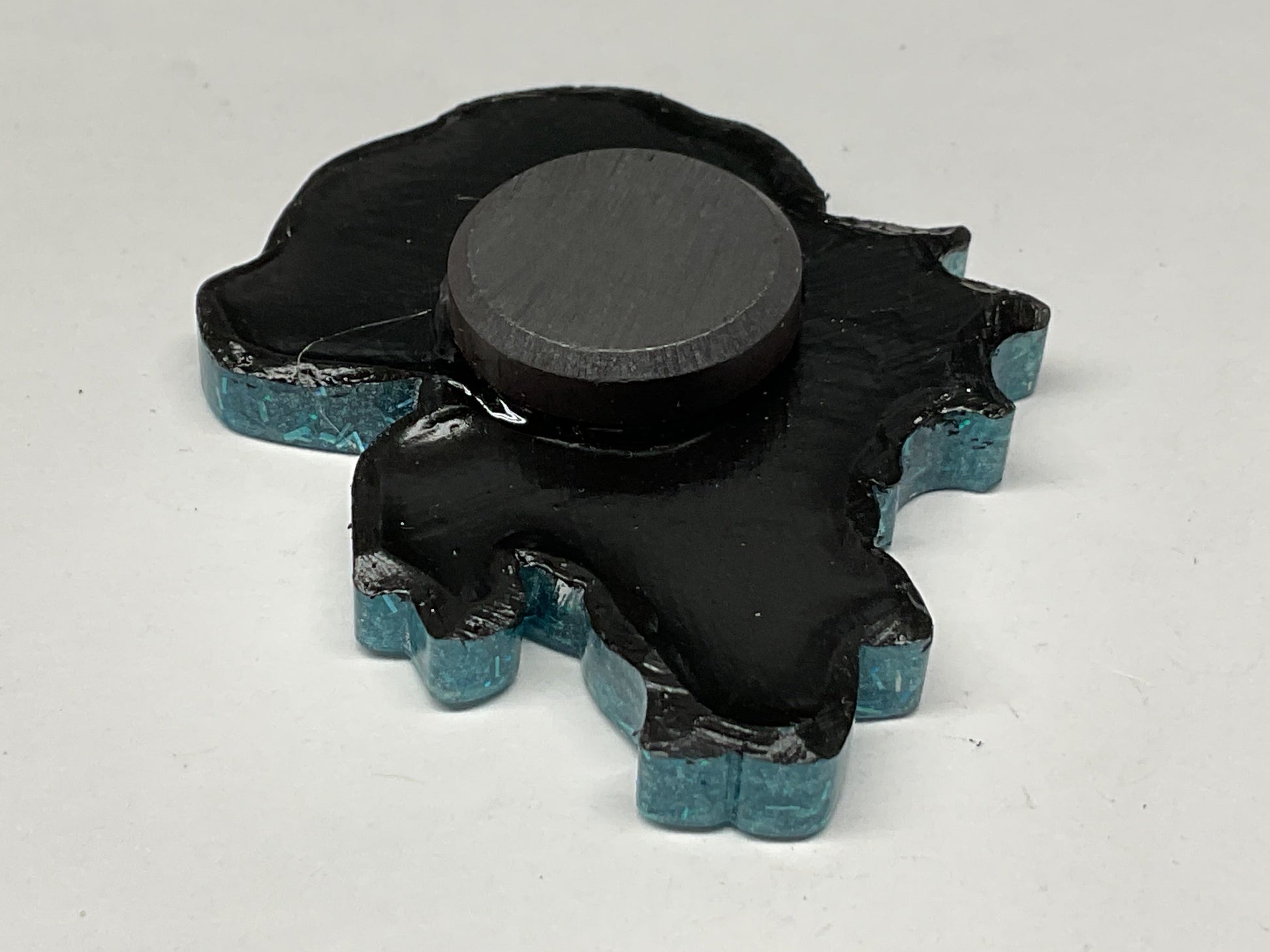 Meet the magnet that will stick to your metal surfaces with the force of a thousand suns, the Jersey Devil magnet. Glittery, teal, and impossibly cute, this tiny beast sports curled horns, bat wings, and a heart shaped tail. It is ready to hold your notes, photos, or that pizza coupon like the devilish boss that it is.