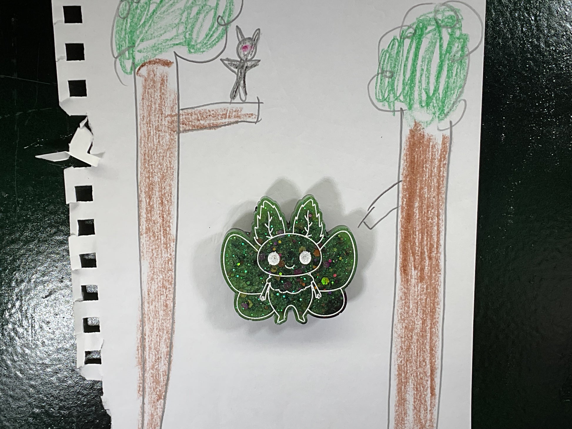 Get ready to stun your fridge with this dazzling green glitter Mothman magnet. This fierce little cutie sparkles with a rich green and multicolored glitter. It is hand painted with whimsical white outlines that highlight its playful features and big, bright eyes. It’s not just a magnet, it’s a bold statement piece ready to grip your grocery list with unyielding charm.