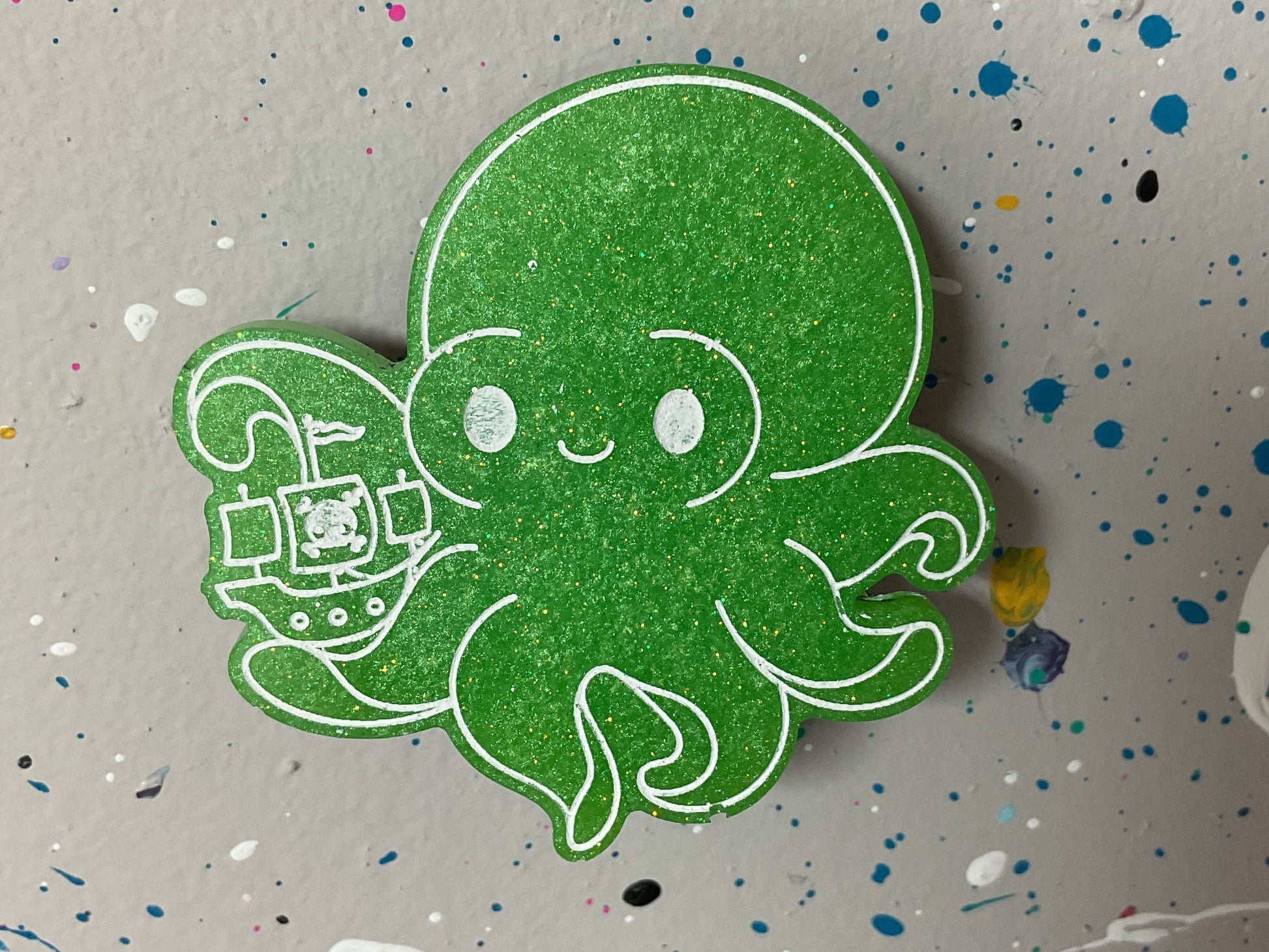 Say hello to the neon green Kraken magnet. This octopus cryptid is dripping in sparkly neon green glitter and clutching a pirate ship like it’s about to sink your grocery lists. Forget boring magnets, this one has got personality, sparkle, and grip tight enough to hold your wildest fridge chaos in place.