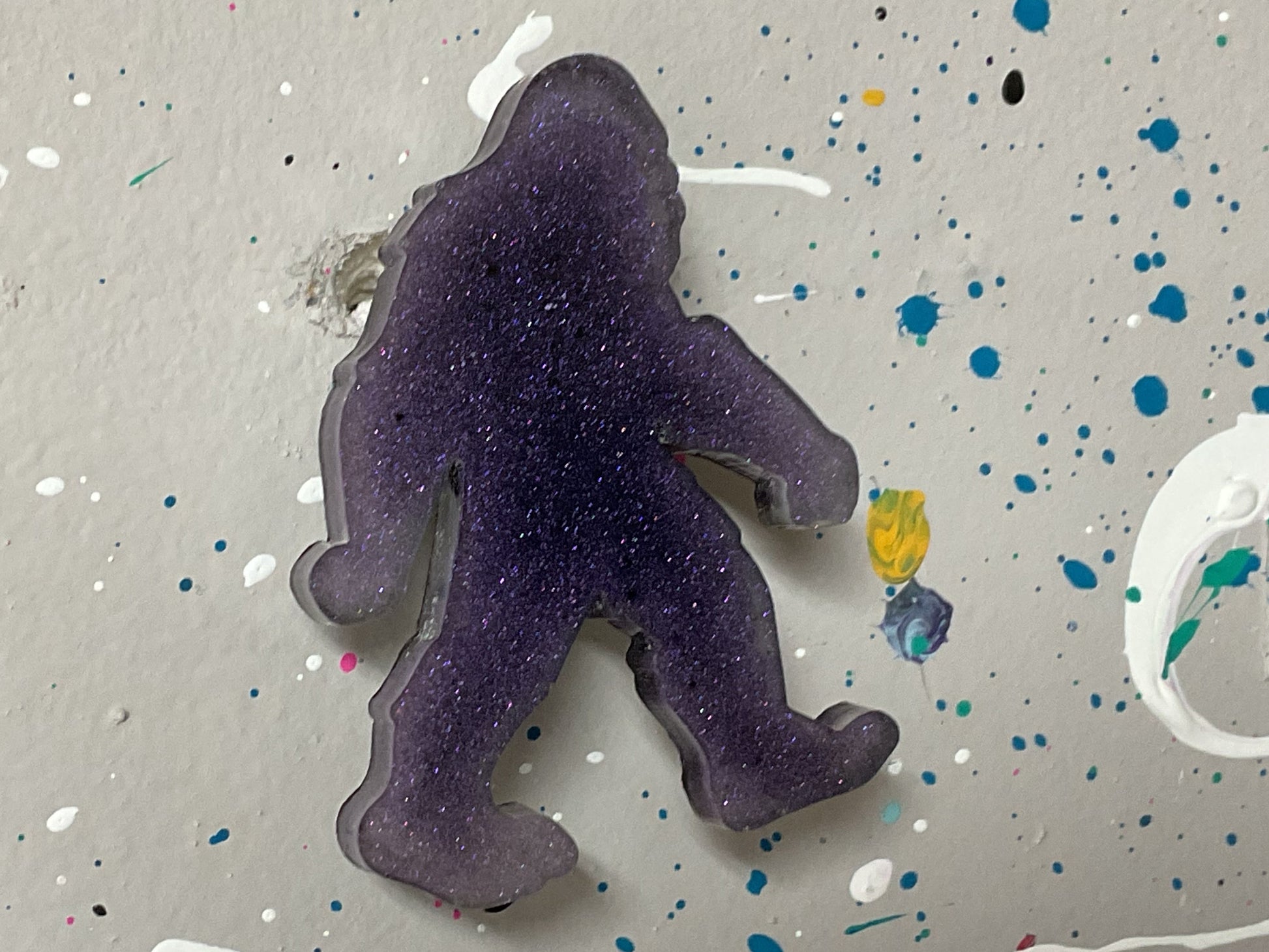 Bring a sprinkle of mystery and shimmer to your fridge or workspace with this purple Bigfoot resin magnet. Handmade with a love of purple, it captures the iconic Bigfoot silhouette in a playful design that adds charm and sparkle to any space. It is perfect for holding notes, photos, or reminders securely while adding a touch of folklore fun to your everyday life.