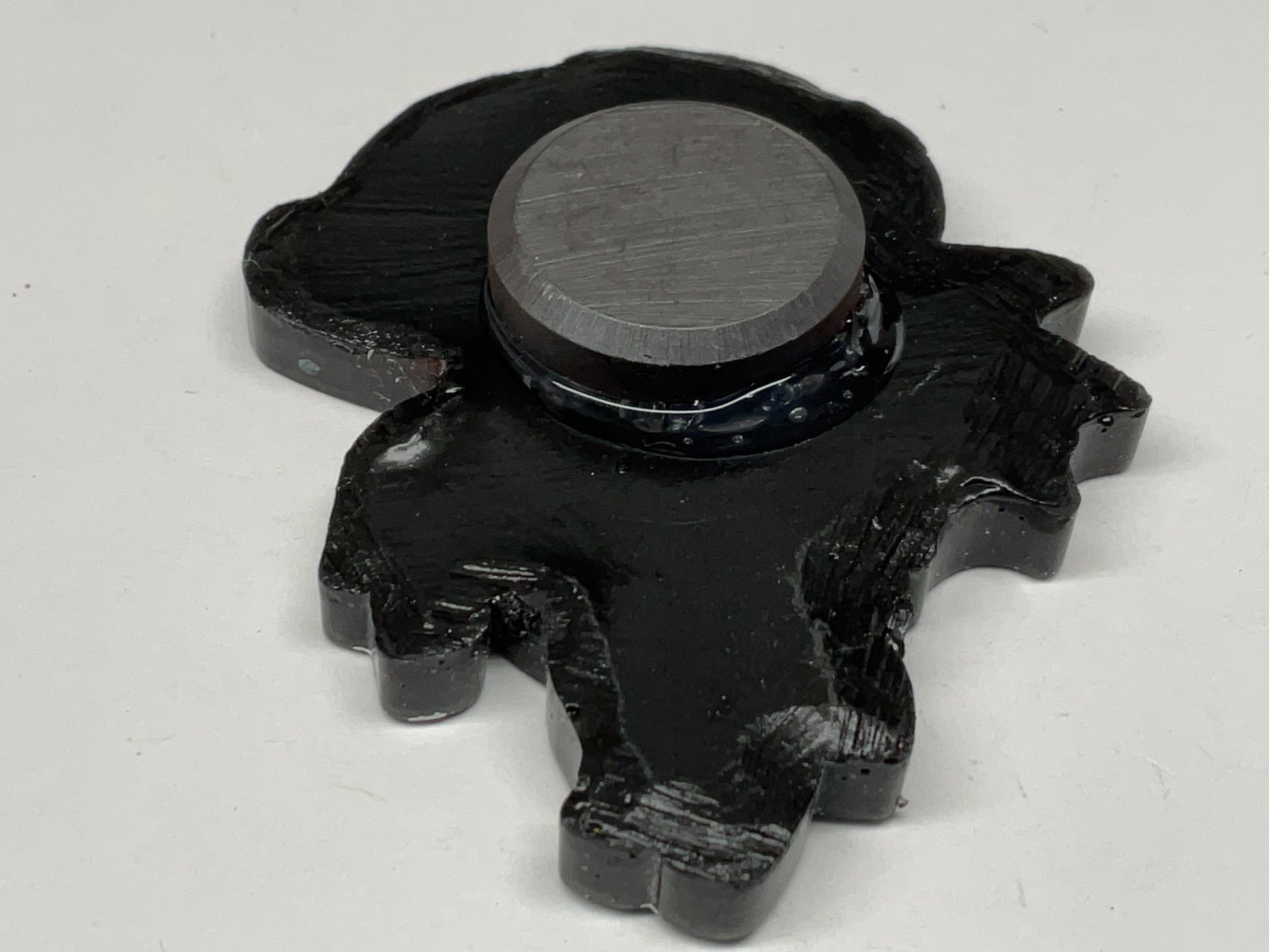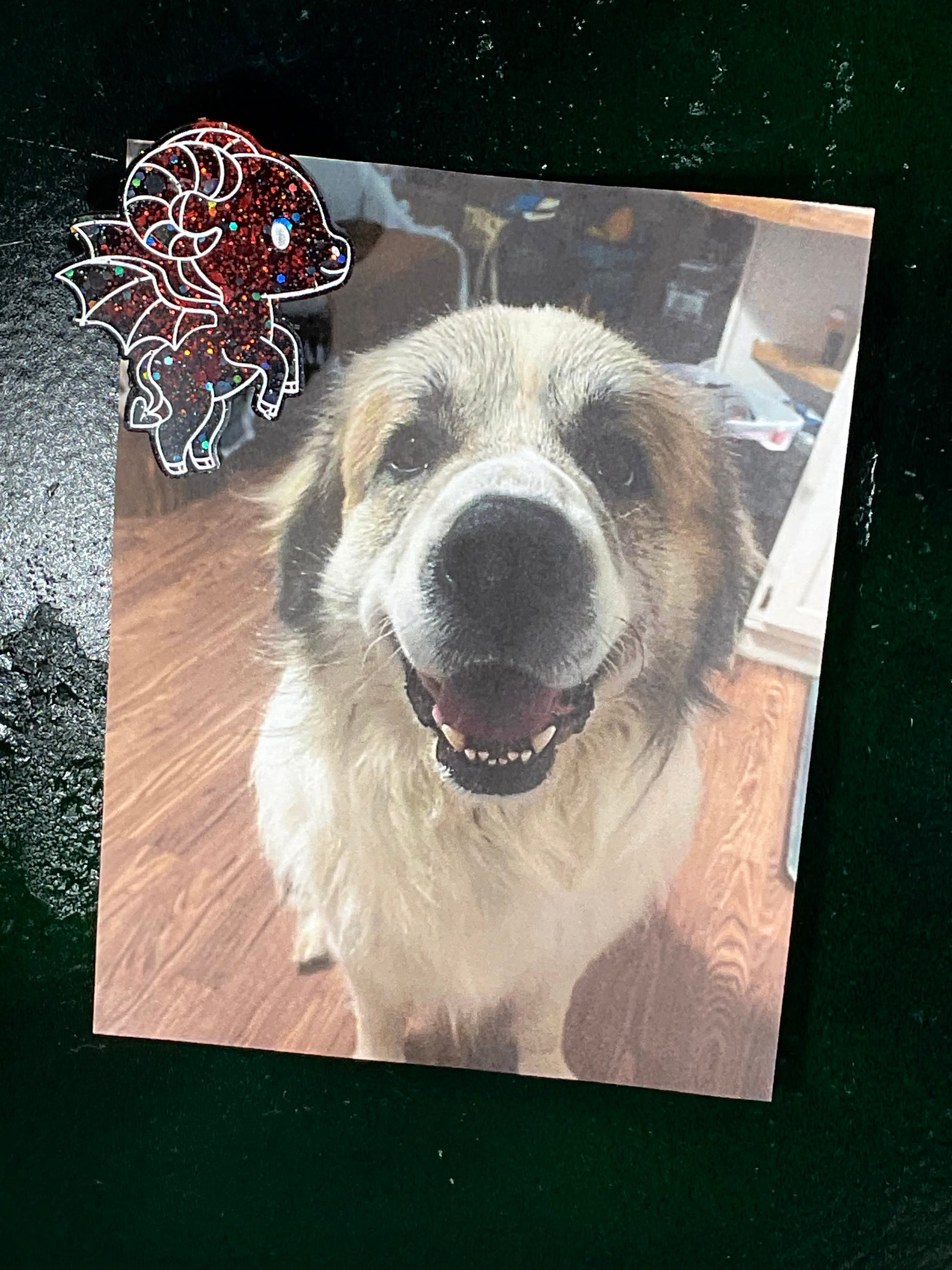 Meet the red and black Jersey Devil magnet, a playful little cryptid shimmering with fiery red glitter and outlined in crisp white. This devilish creature with curled horns, bat wings, and a heart tipped tail is ready to conquer your fridge and hold your notes with fierce charm.