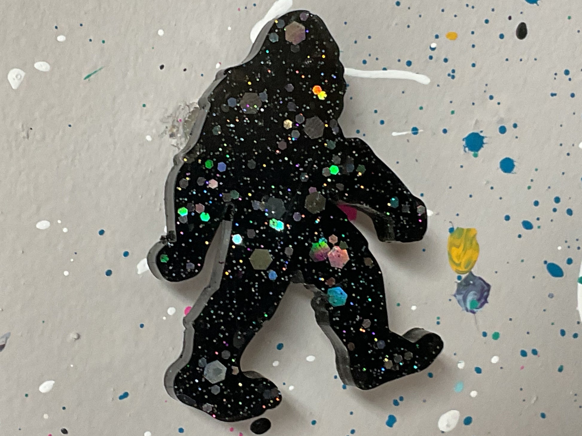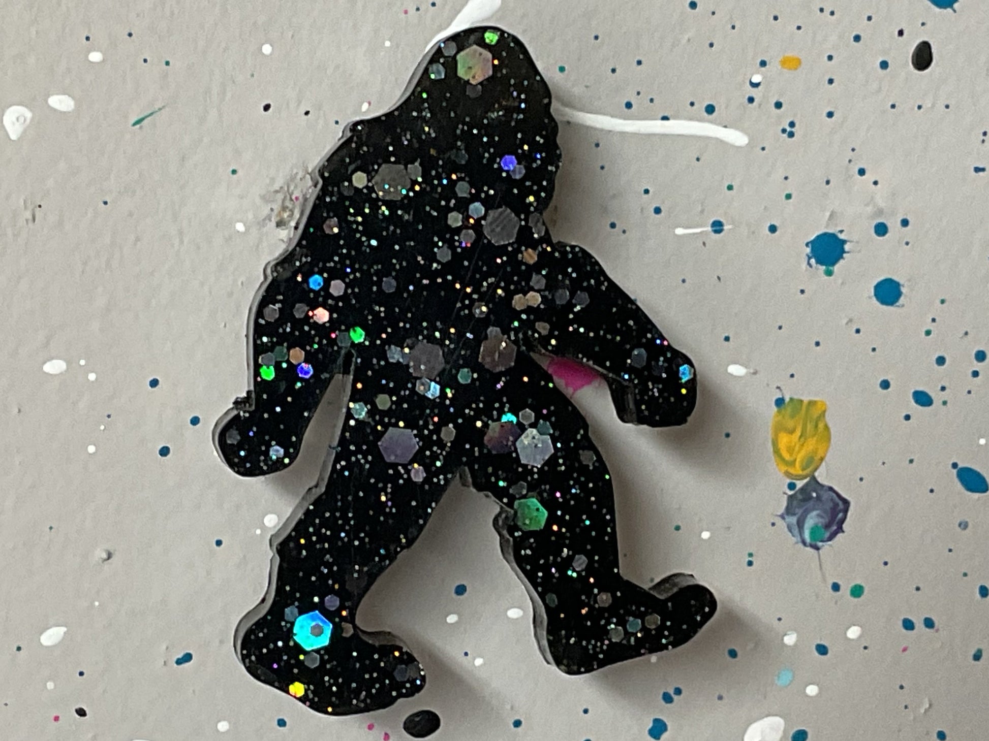 This magnet is a black Bigloo t silhouette blasted with holographic glitter that catches the light like a disco ball on steroids. It’s not just a magnet, it's a Bigfoot with a grip so fierce it'll crush your papers and photos into submission (because of its strong ceramic magnet disc.) This is a glitter packed nightmare that will stalk your fridge, and your leftovers.